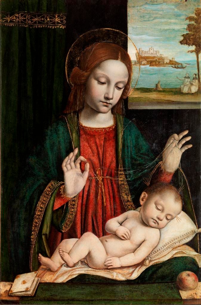 On occasion, you see intentional aberrations. At the Musée Condé, Luini’s Infant Jesus literally tells you to look away. The snake is dead, and the naked Christ’s foot rests on a fresh apple with a bite taken out of it. One looks at the center, but the exposed Child looks back, pointing to a small cross, as if to say, “I’ve given you what you want, now take what you need.”