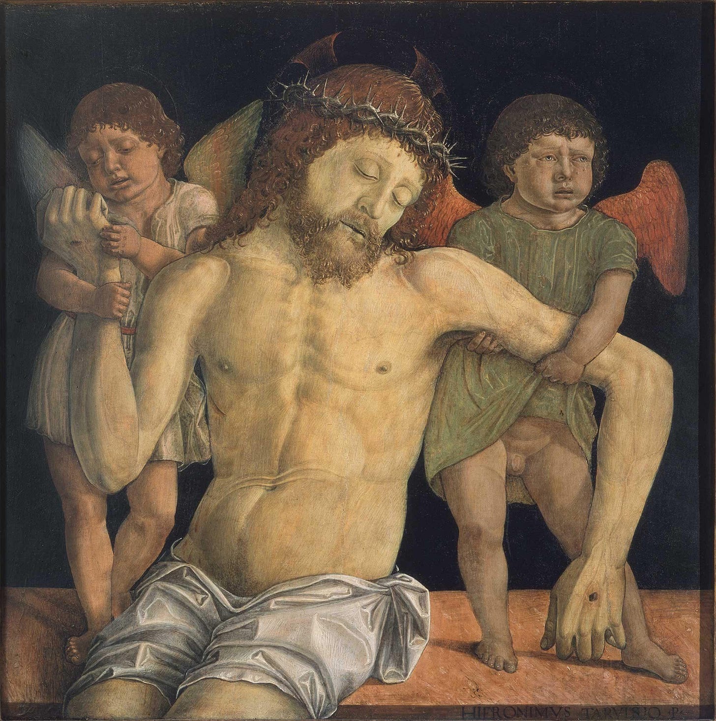 Meanwhile, the normative adult Christ has abs, nice pecs, and a habit of bearing a supplicating or even seductive pose as he dies. The modesty shroud covers the genitals, but the legs are exposed, beneath a torso that bears down upon the hips, which have seemingly collapsed. Treviso’s Christ Supported by Two Angels is astonishing as one of the weeping infant angels lifts his tunic to expose his genitals, as if to say, “Isn’t it enough? How could you possibly want more?”